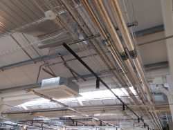 The supply and extract ductwork was run at high level throughout the warehouse and terminated onto bellmouth arrangements complete with mesh grilles. The restaurant seating AHU ductwork was installed in flat oval within the exposed areas with the air supply provided via adjustable double deflection type diffusers complete with VCD’s. VRF Air Conditioning systems were installed to the restaurant, soft play area, community room and coffee shop, with 4-way blow cassette units at high level. Heat Pump split AC systems were installed to serve the main tills area, managers office, admin office and staff room.